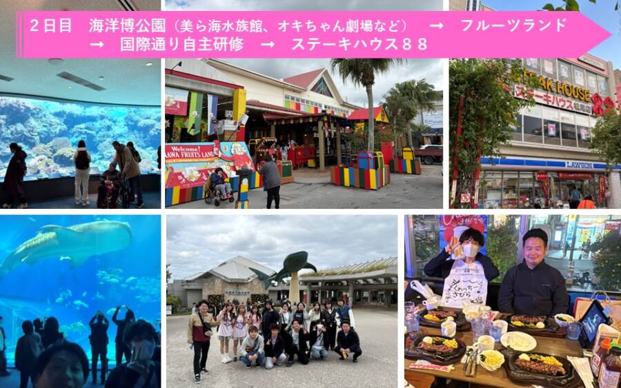 2日目は海洋博公園(美ら海水族館・オキちゃん劇場)を楽しみ、昼食はOKINAWAフルーツランドで地元の料理をいただきました🐠🐖