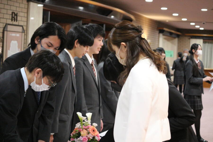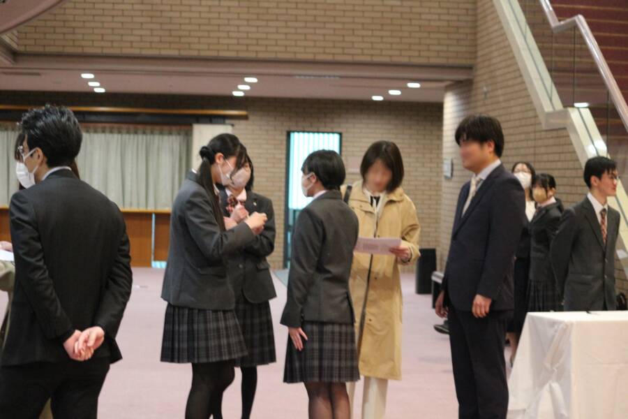生徒会(在校生)の皆さんが入口で新入生を迎え、一人ひとりに「🌟盛岡中央高校へようこそ!🌟」の気持ちを込めて校章を付けていました😊